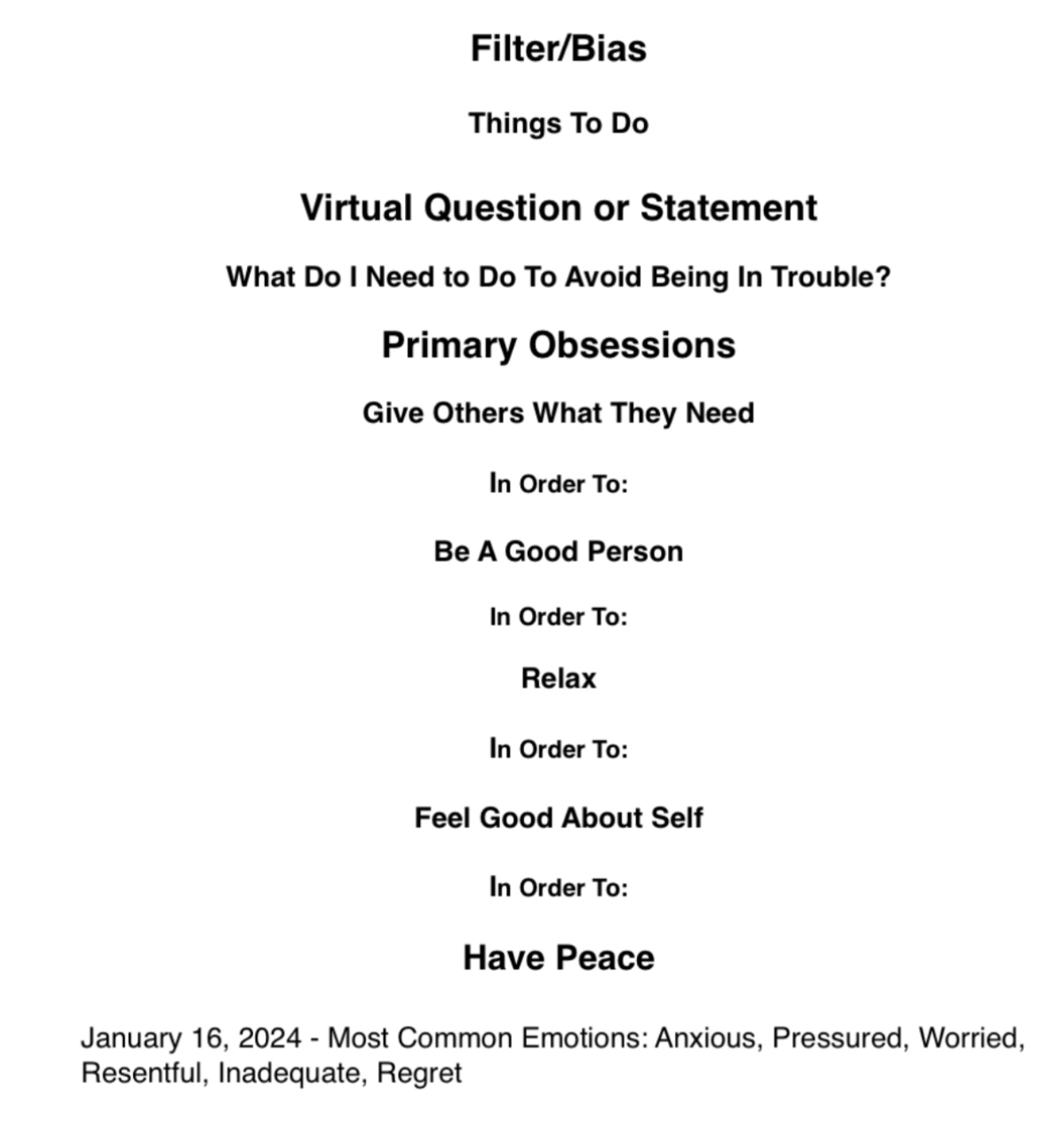 Formed before the age of eight (8) during an emotionally charged moment/s, our Primary Obsessions become the focal point of our lives. They mirror the desires typical of a child aged 5-7 years. They are about doing, being, or getting. By reflecting on the Emotional Menus PDF and the contexts in which these emotions arise, you may begin to recognize your obsessions.
