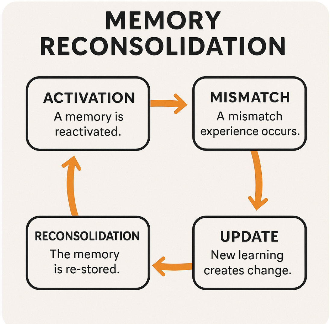 Memory reconsolidation is a neurobiological process in which emotional memories become temporarily “unstable” when recalled. During this 4–6 hour window, the brain is open to change—allowing new emotional learning to be integrated directly into the old memory.