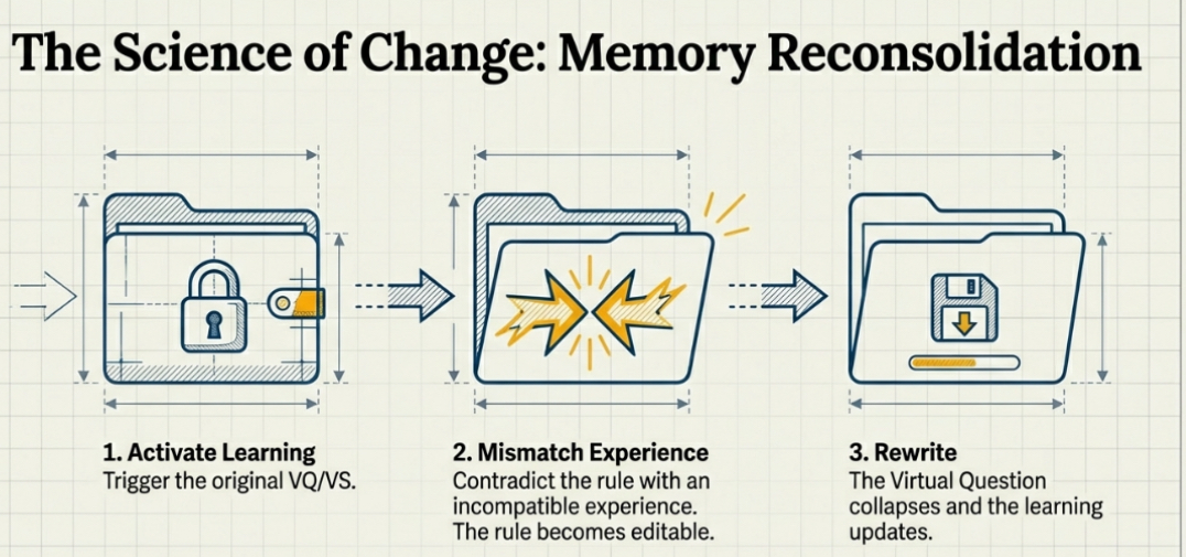 When the original learning is activated — and then contradicted by a corrective, incompatible experience — the old rule becomes editable.